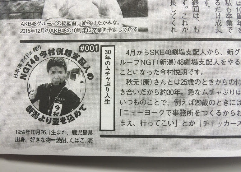 「日本海アイドル便り・NGT48今村悦朗支配人の新潟より愛を込めて」というコラムの連載を