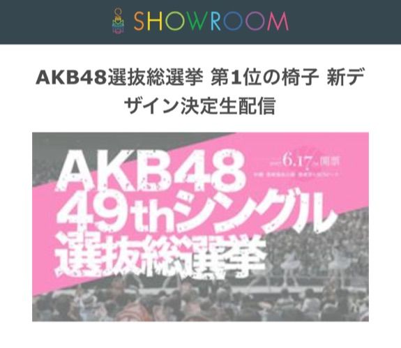 5/15(月)21時30分頃からSHOWROOMにて「AKB48選抜総選挙第1位の椅子新デザイン決定生配信」が放送されます。
